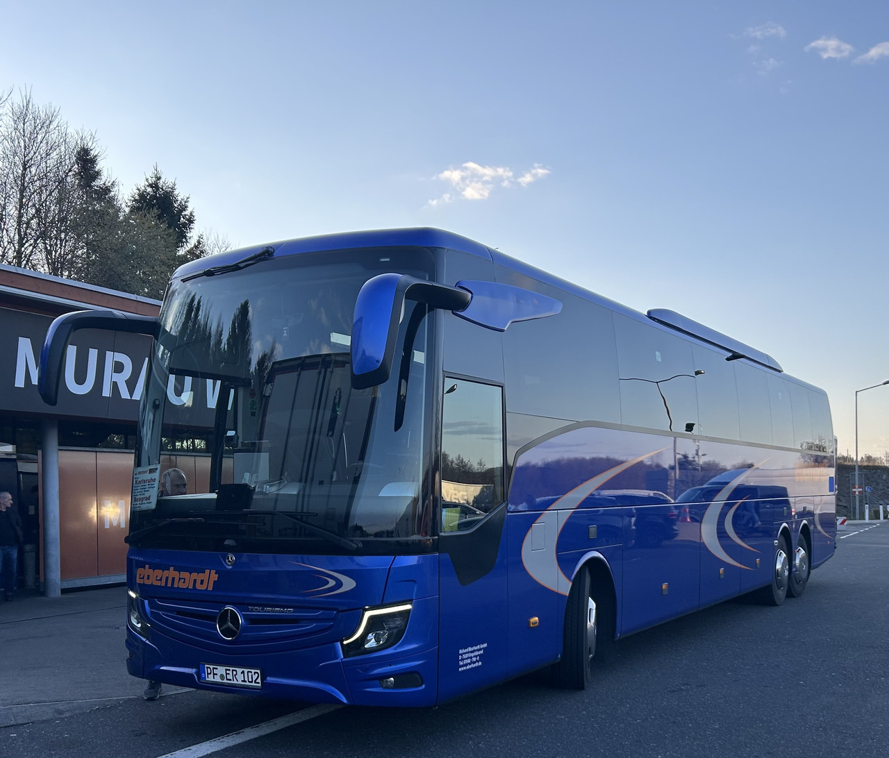 Prelepi Mercedes-Benz Tourismo od Eberhardta. Inače, oni su jedina firma koja vozi prema našem Balkanu i poseduje RAL sertifikat, a saobraćaju vozilima sa rasporedom sedenja od 4 i 5 zvezdica.Inace, ide Setra 517 HD, koja ima samo 48 sedišta umesto 59. Izuzetno ljubazno osoblje i sve je za svaku pohvalu :)